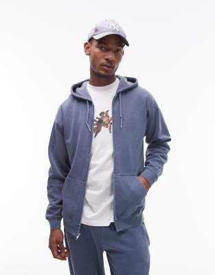 Sudadera azul con capucha, cremallera y lavado envejecido de Topman