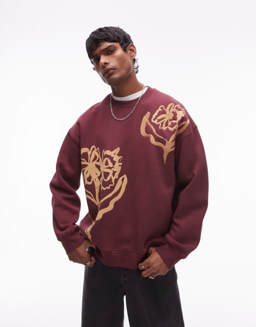 Sudadera burdeos extragrande con bordado y estampado floral abstracto delantero y trasero de Topman