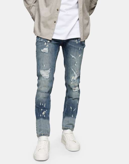 Vaqueros de corte pitillo elástico con lavado medio y diseño rasgado y remandado de mezcla de algodón de Topman