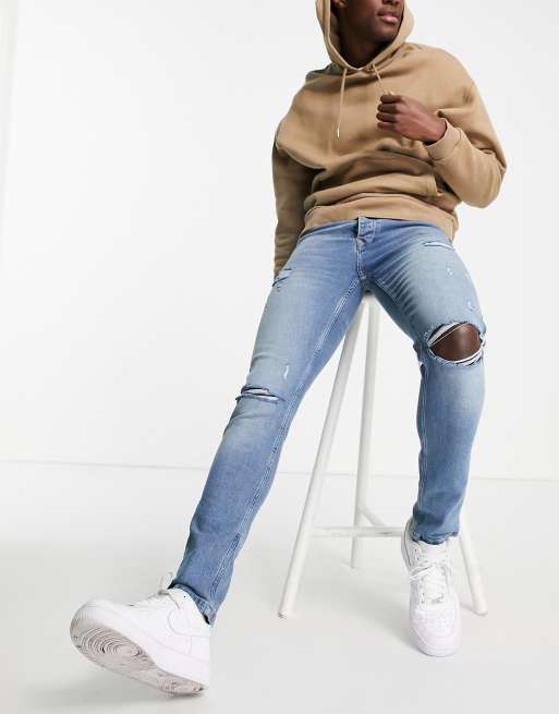 Vaqueros elásticos con lavado medio y diseño rasgado de corte pitillo de Topman