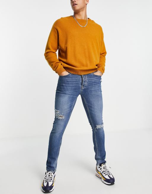 Vaqueros elásticos rasgados con lavado azul medio de corte pitillo de Topman