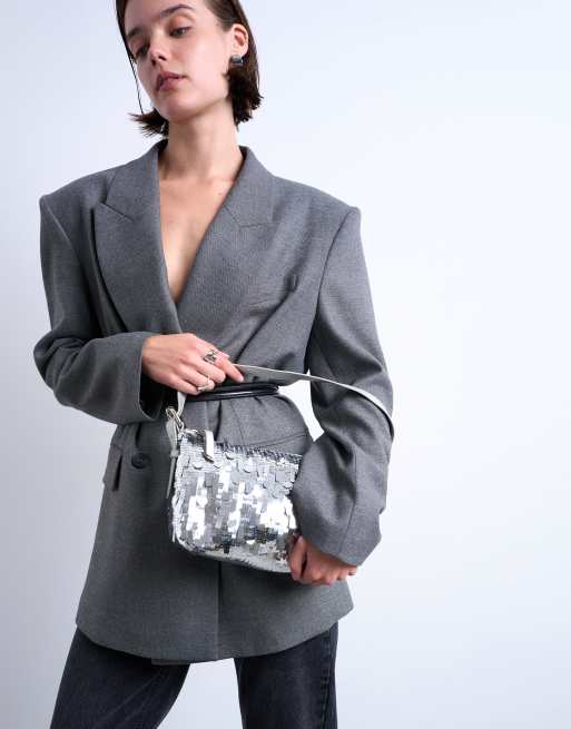 Bolso de hombro plateado de lentejuelas con asa de mano de cuero Sol de Topshop