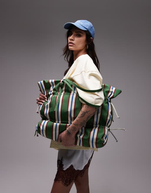 Bolso tote verde a rayas fruncido de nailon Tino de Topshop