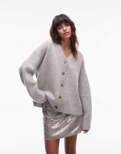 Cárdigan gris claro holgado con cuello de pico de punto 100% de lana de cordero premium de Topshop