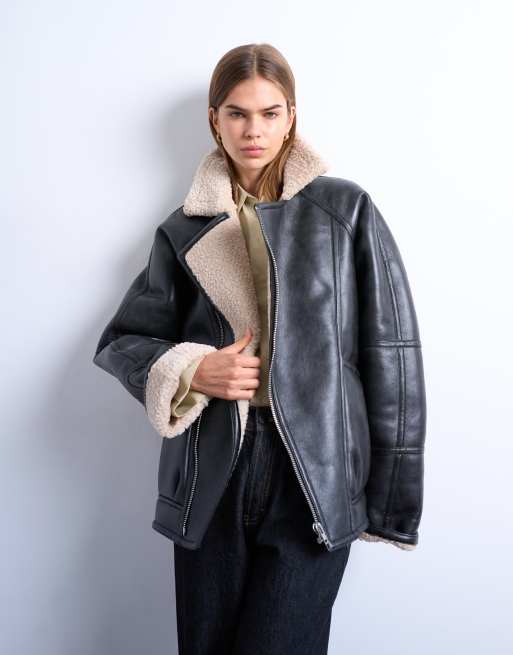 Chaqueta de aviador bomber negra ultragrande con lavado envejecido de borreguito de Topshop