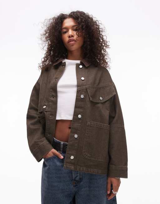 Chaqueta marrón extragrande de algodón con cuello de pana de Topshop