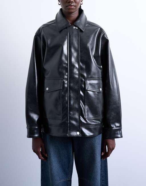 Chaqueta negro brillante estilo camisa con bolsillos de parche y acabado irregular de cuero sintético de Topshop