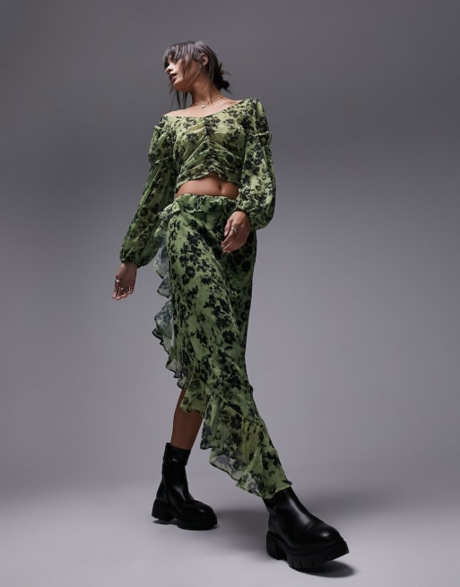 Conjunto de falda midi verde con estampado floral, volantes y bajo sin rematar de Topshop
