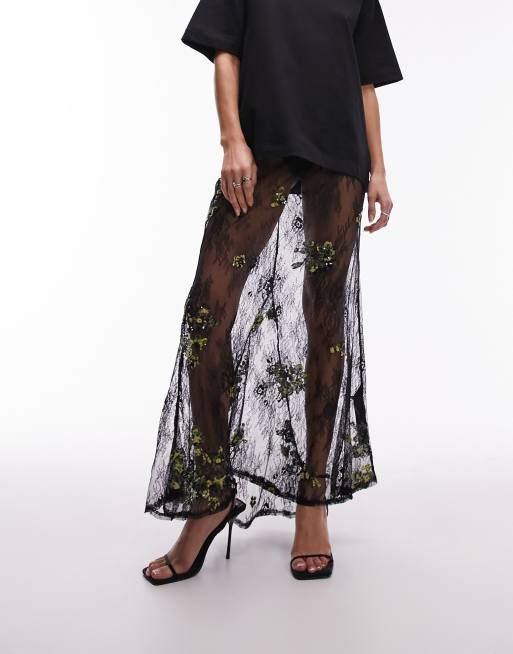 Falda larga negra de encaje adornado de Topshop (parte de un conjunto)