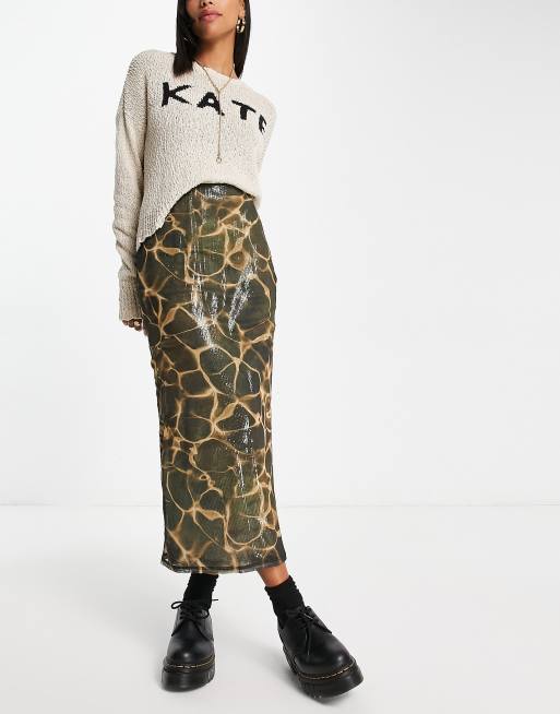 Falda midi beis de lentejuelas con capa de malla estampada de Topshop