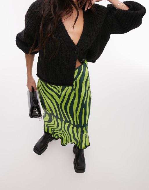 Falda midi verde lima de satén con estampado de cebra y ribete de encaje negro de Topshop