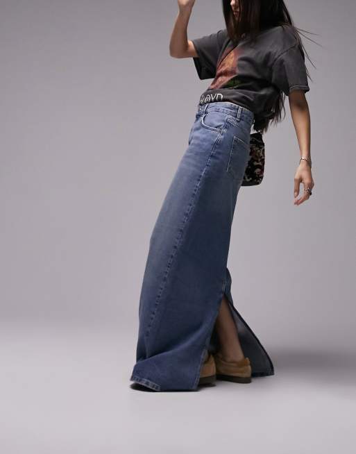Falda vaquera larga azul medio de talle bajo y estilo años 2000 de Topshop