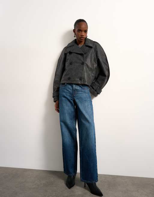 Gabardina corta negro lavado con mangas ovoides de cuero sintético de Topshop