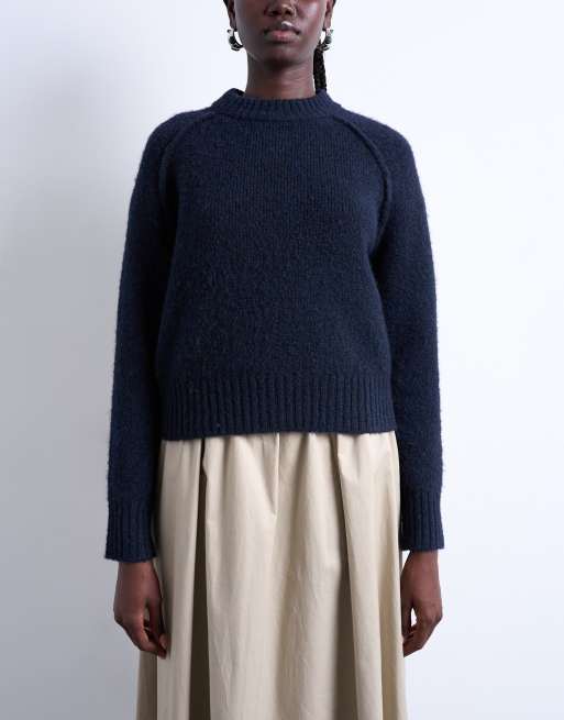 Jersey azul marino con mangas raglán y costuras a la vista de punto de Topshop