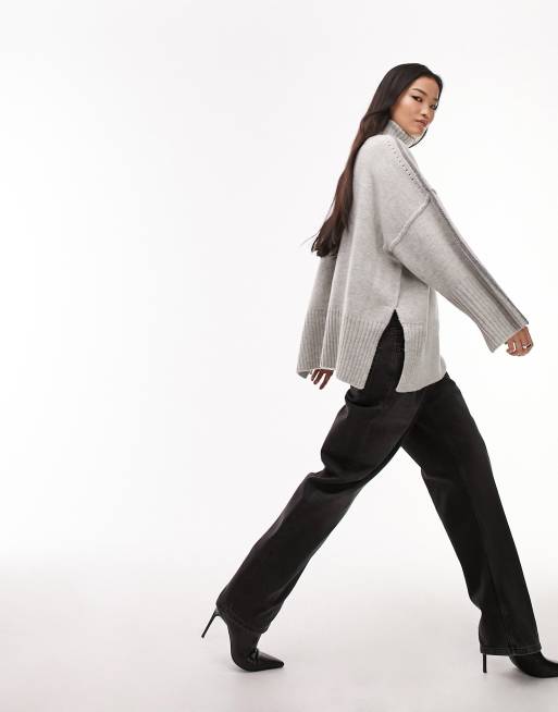 Jersey gris extragrande con cuello vuelto de lana de oveja de punto premium de Topshop