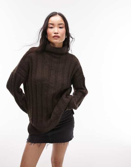 Jersey marrón extragrande con cuello alzado de punto grueso de canalé de Topshop