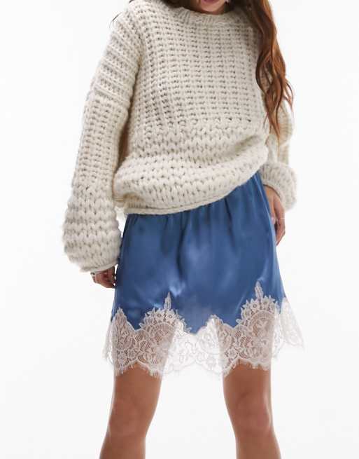 Minifalda azul de satén estilo combinación con ribete de encaje de Topshop