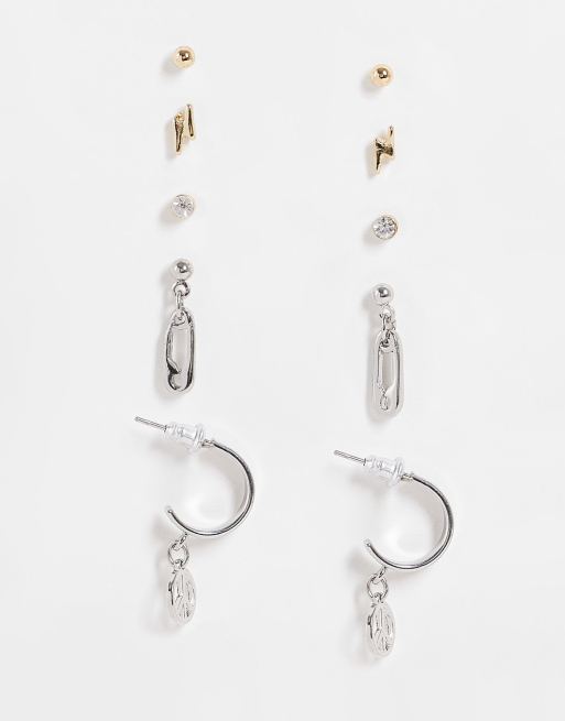 Multipack de 5 pares de pendientes en tonos metálicos variados con diseño de imperdible y signo de la paz de Topshop