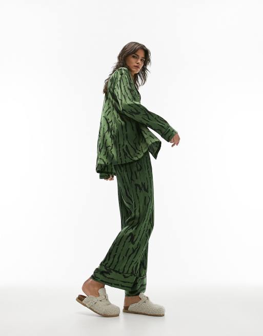 Pijama verde de camisa con ribetes y pantalones con estampado abstracto de tigre de satén de Topshop