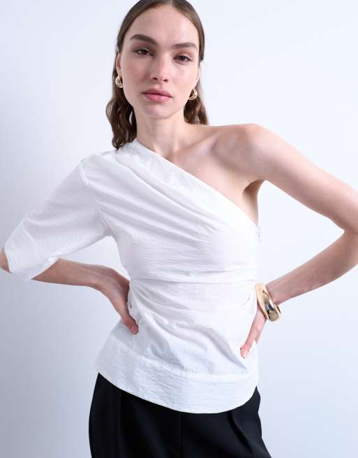 Top blanco con escote drapeado y hombro descubierto de Topshop