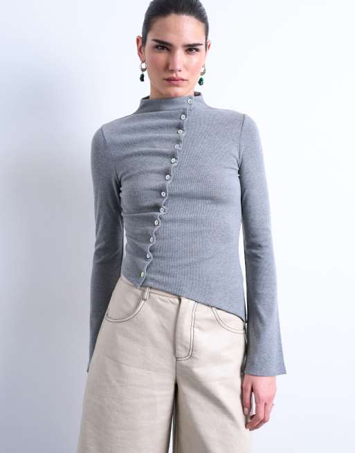 Top gris jaspeado de manga larga con cuello alto y tapeta de botones con volantes de Topshop