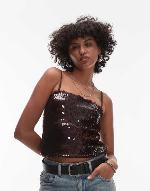 Top marrón de tirantes con diseño integral de lentejuelas de Topshop