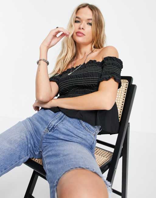Top negro con diseño fruncido, escote Bardot y pespuntes en contraste de Topshop