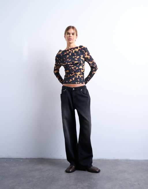Top negro de manga larga con estampado animal efecto carey y cuello desbocado de malla de Topshop