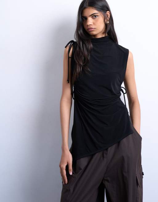 Top negro estilo túnica con cuello alto y detalles fruncidos de Topshop