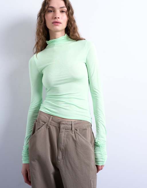 Top verde menta de manga larga con cuello alto de viscosa de Topshop