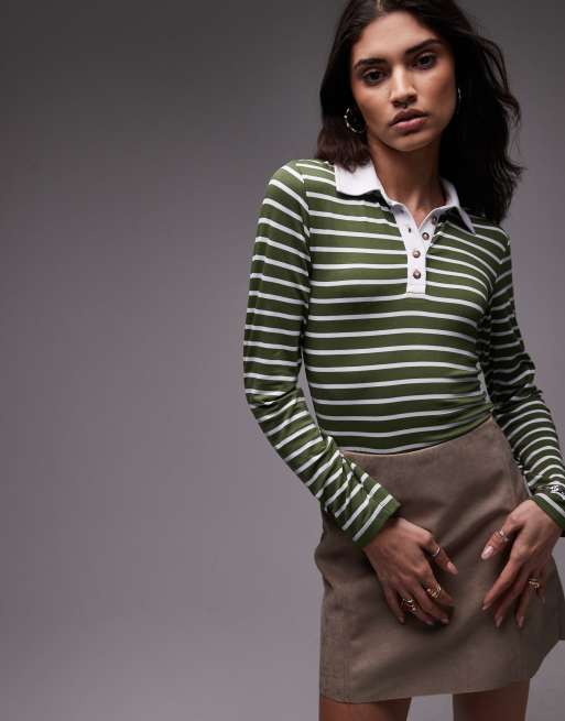Top verde oliva a rayas estilo polo de rugby de manga larga con diseño encogido de punto liso de Topshop