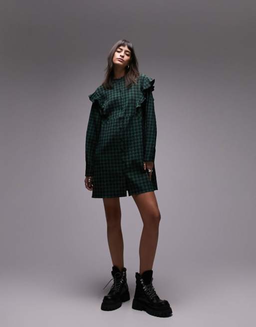 Vestido camisero corto a cuadros verdes y negros abotonado de Topshop