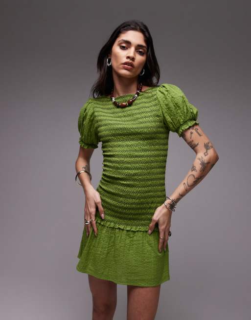 Vestido corto verde fruncido con pespuntes en contraste de Topshop