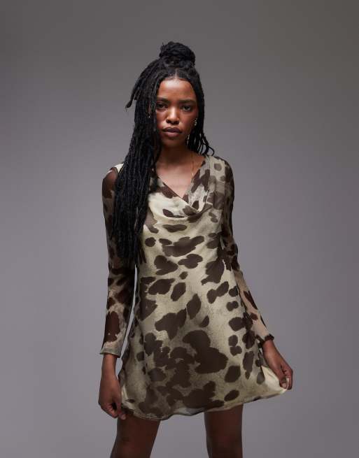Vestido de tarde corto de manga larga con cuello desbocado y estampado animal desdibujado de Topshop