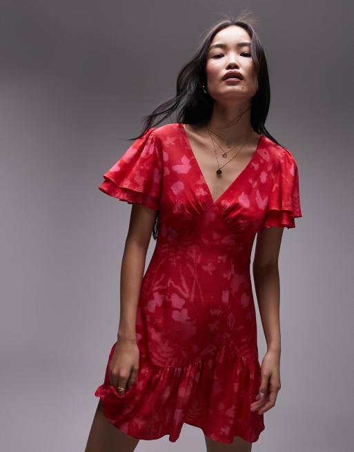Vestido de tarde rojo y rosa con estampado floral y mangas ángel Bella de Topshop