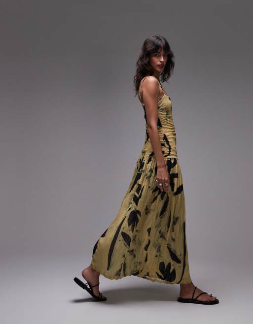 Vestido largo amarillo con estampado floral y cintura baja de malla rugosa de Topshop