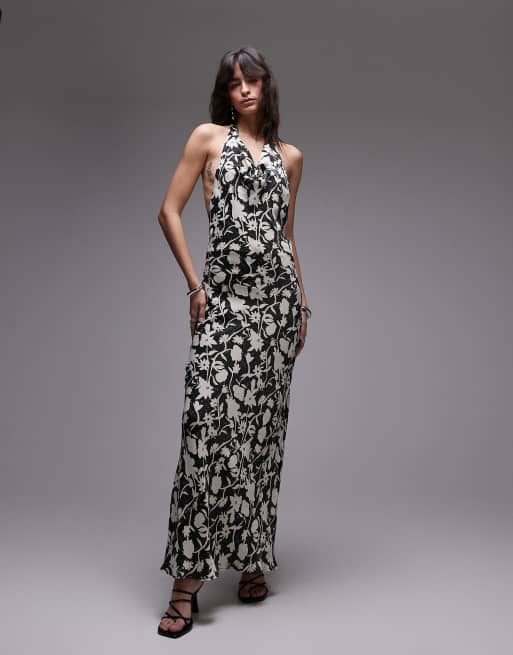 Vestido largo con estampado floral y cuello halter subido de satén de Topshop