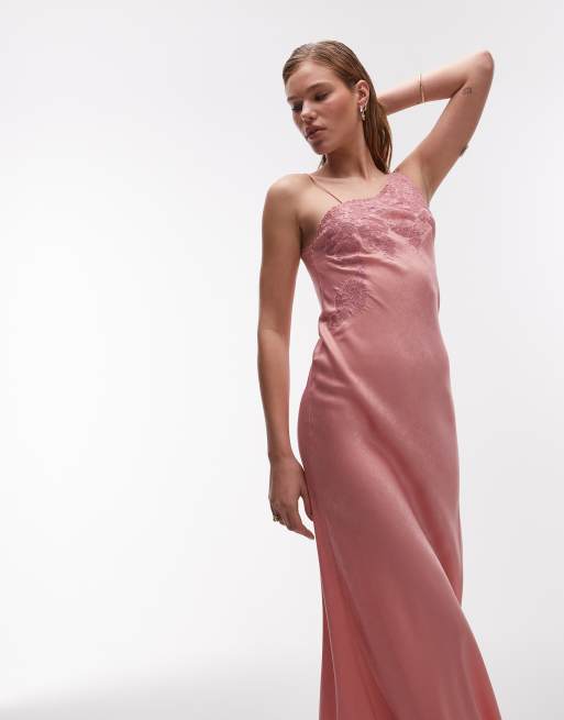 Vestido largo rosa asimétrico con detalle de encaje calado de Topshop