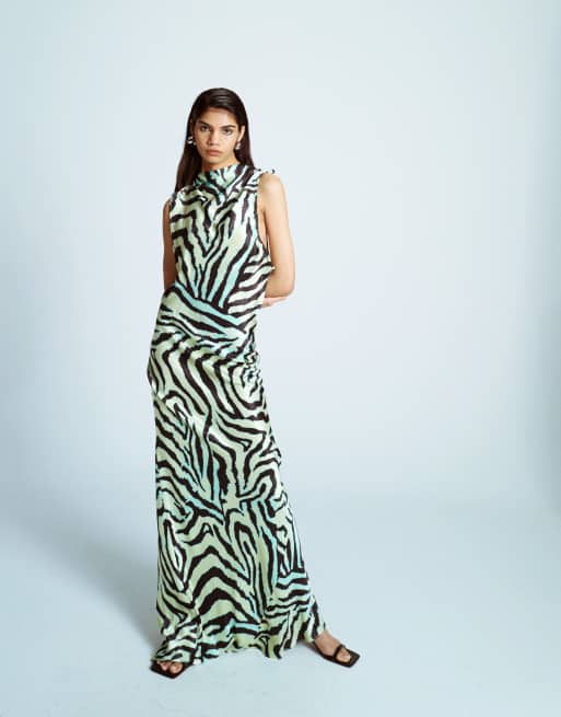Vestido largo verde para eventos especiales de corte al bies con estampado de cebra y sisas fruncidas de Topshop