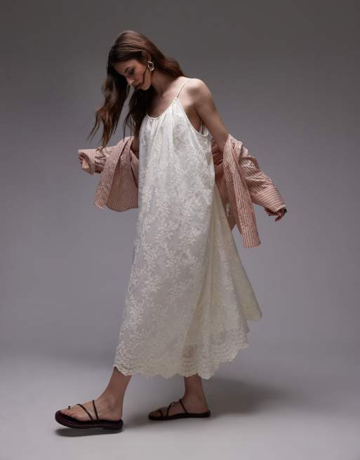 Vestido midi blanco marfil con diseño bordado y tirantes anudados de Topshop