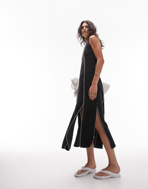 Vestido midi negro sin mangas con aberturas y pespuntes en contraste de Topshop