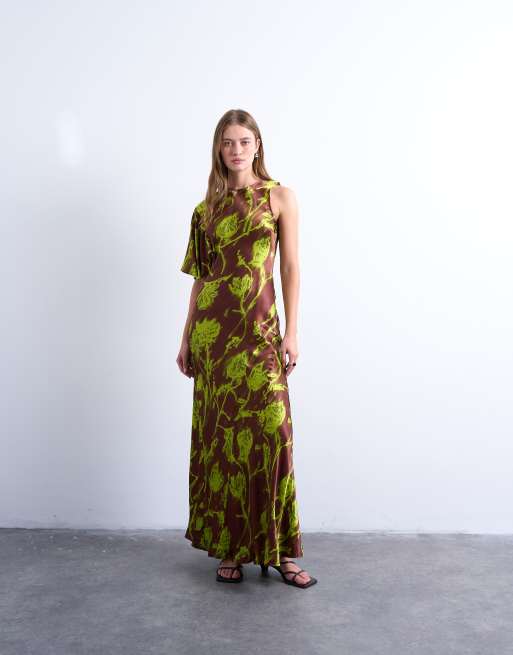 Vestido midi rosa para eventos especiales con estampado de rosas difuminado, manga asimétrica y bajo de corte amplio de Topshop