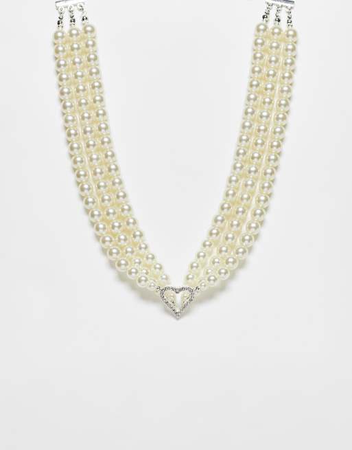 Collar plateado de tres hileras de perlas con colgante en forma de corazón de True Decadence