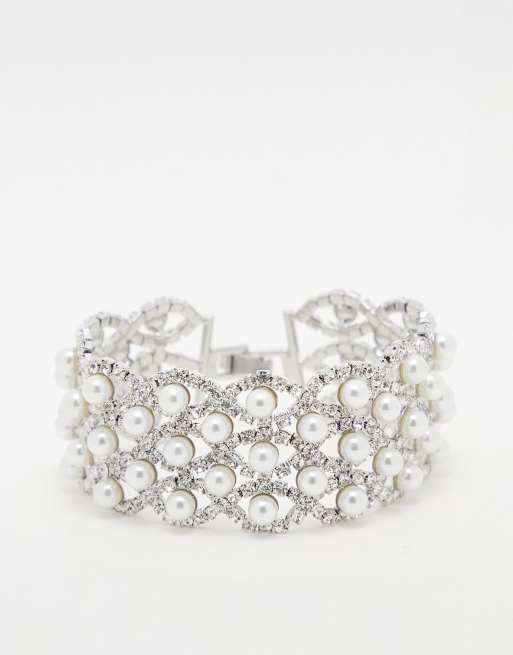 Pulsera plateada estilo celosía de cristales y perlas de True Decadence