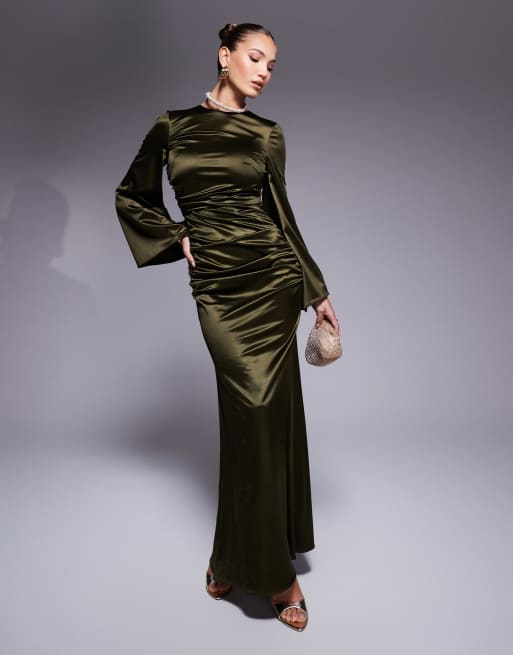 Vestido largo caqui con mangas ángel de satén de True Violet