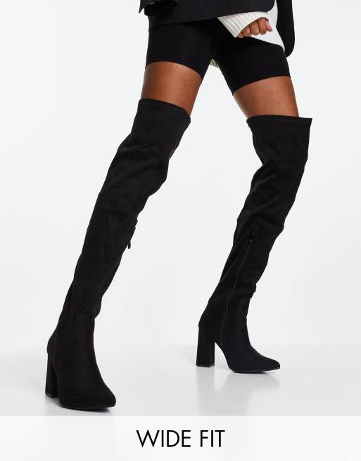 Botas negras por el muslo con tacón de Truffle Collection Wide Fit