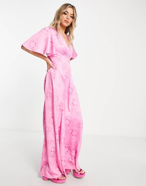 Vestido largo con estampado de corazones sonrientes y mangas acampanadas de Twisted Wunder