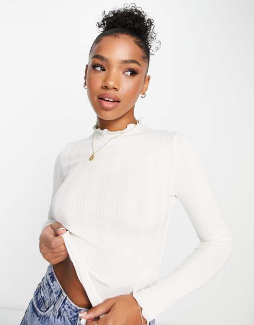 Top blanco de manga larga con bordes ondulados de Urban Revivo