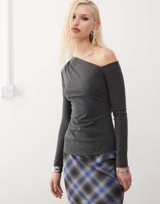 Top gris jaspeado ceñido con escote Bardot de Urban Revivo