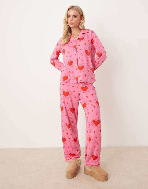 Pijama de pantalones y top de manga larga con cuello de solapas y estampado de corazones brillantes de Urban Threads Petite